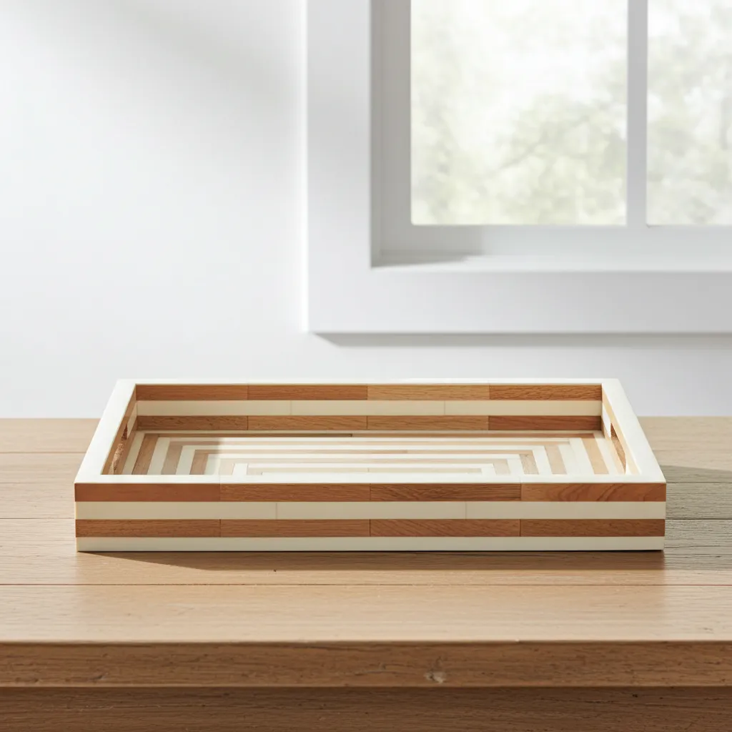 This bone inlay tray in a 14×10 inch size features a white and brown concentric maze pattern that creates a clean, structured look for modern décor collections. Each piece is handmade with precise inlay work on a strong wooden base, making it suitable for serving, styling, or retail presentation. Its refined geometric layout appeals to décor brands, gifting companies, and hospitality buyers. Manufactured and exported by Razvi Exports, this tray is available for bulk orders, private label customization, and consistent worldwide supply.