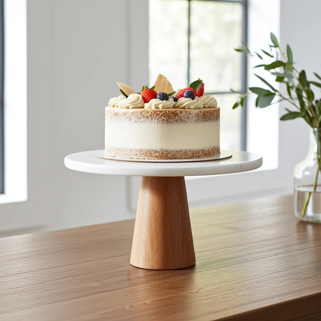 Overview of the Marble Cake Stand with Wood Base
