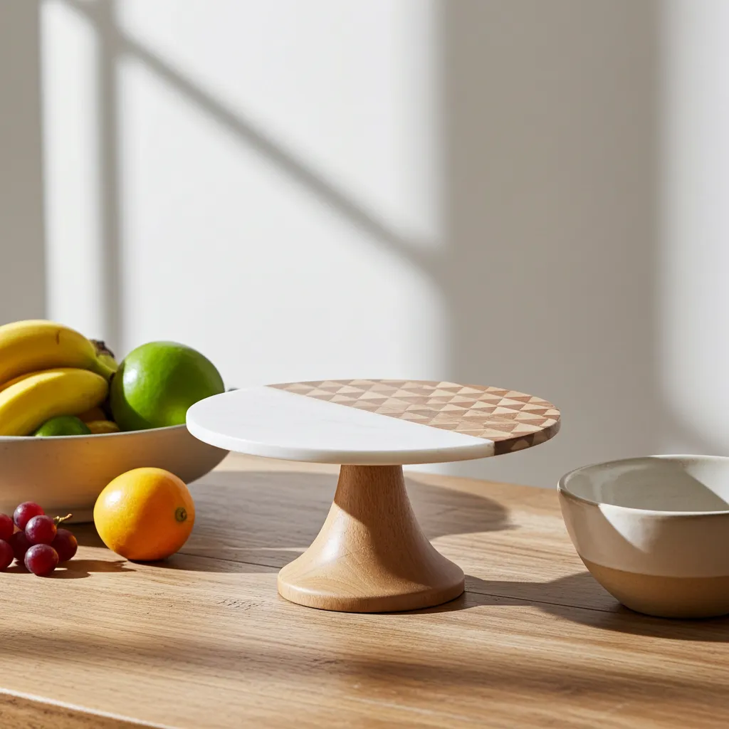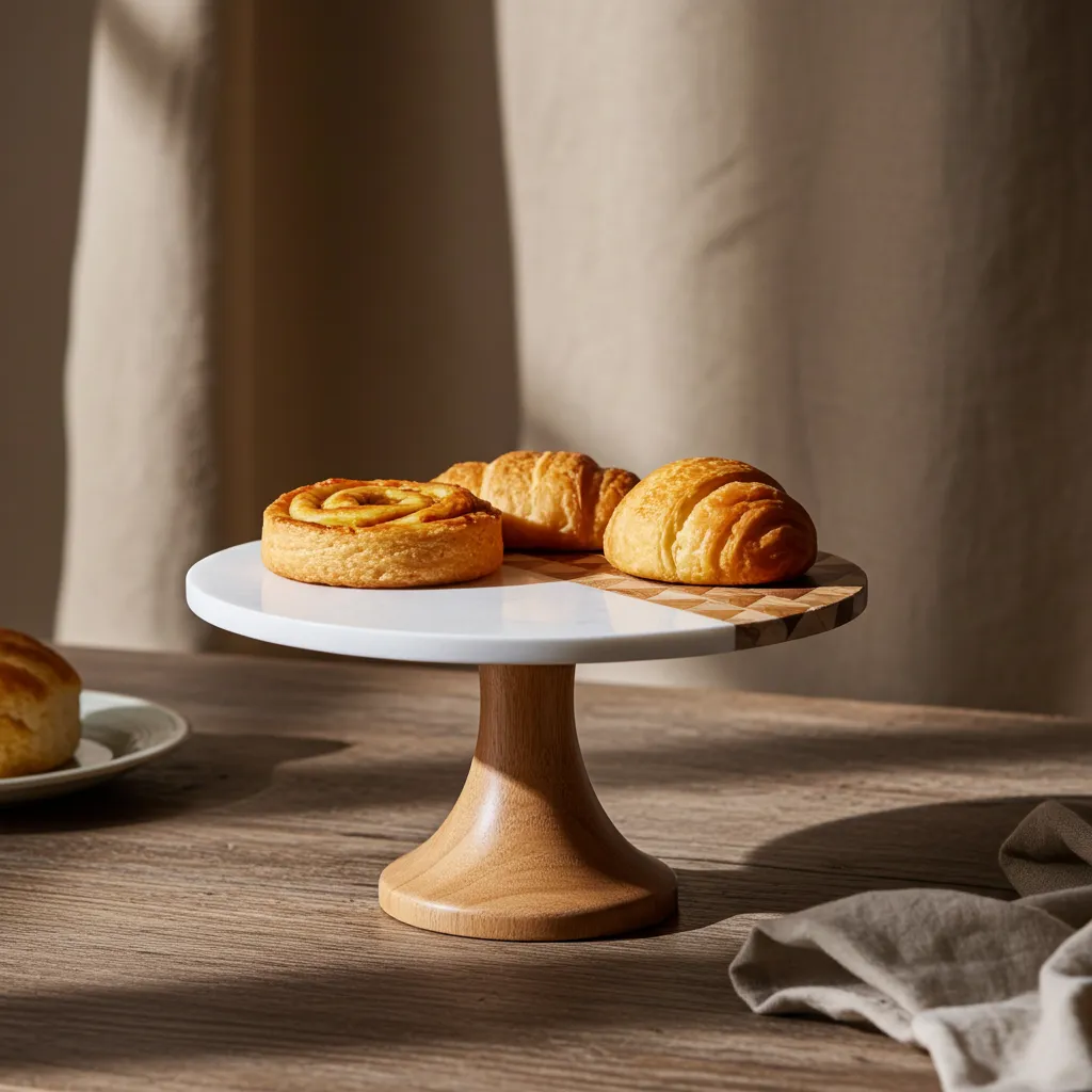 Matching marble & wood products such as cake stands, buffet risers, and trays