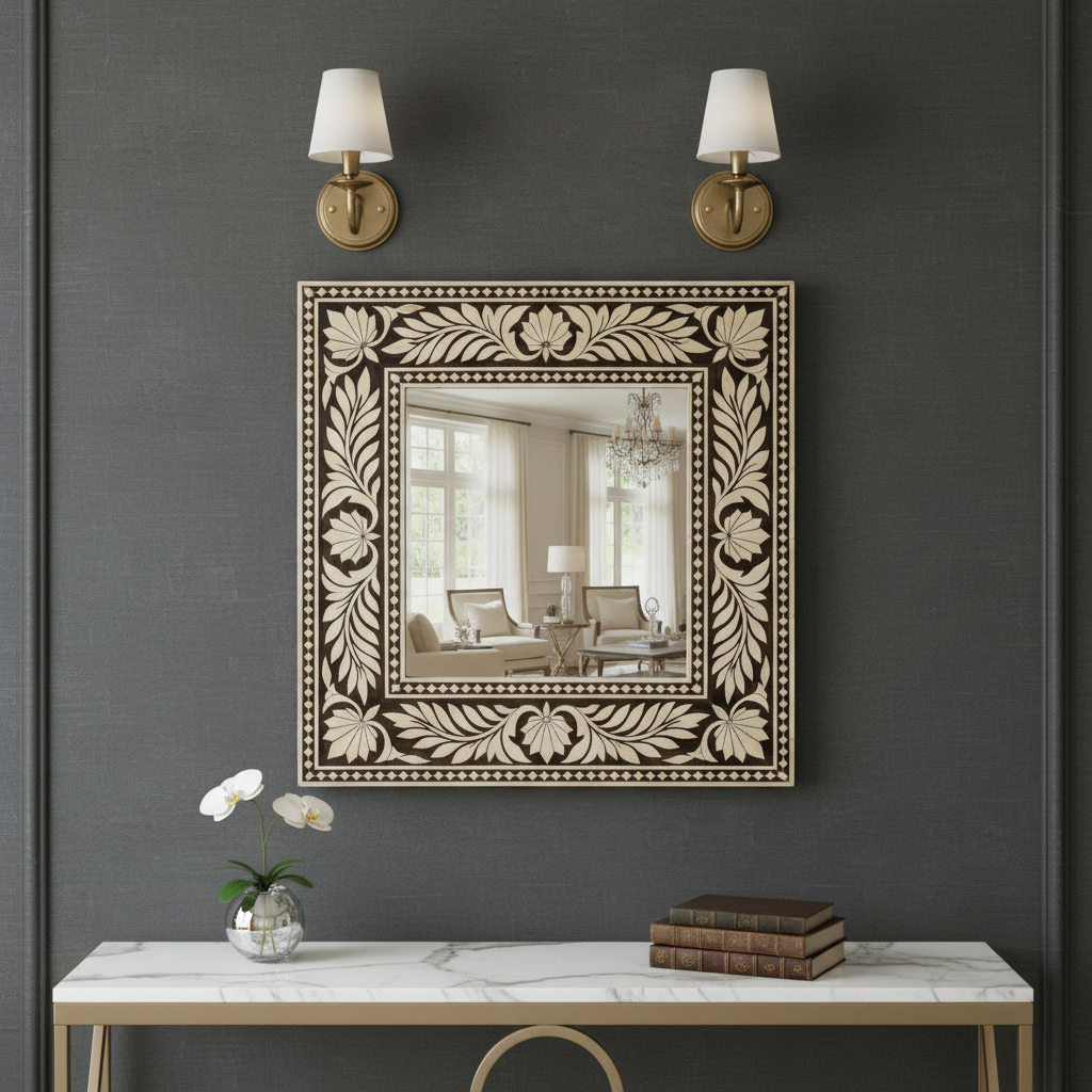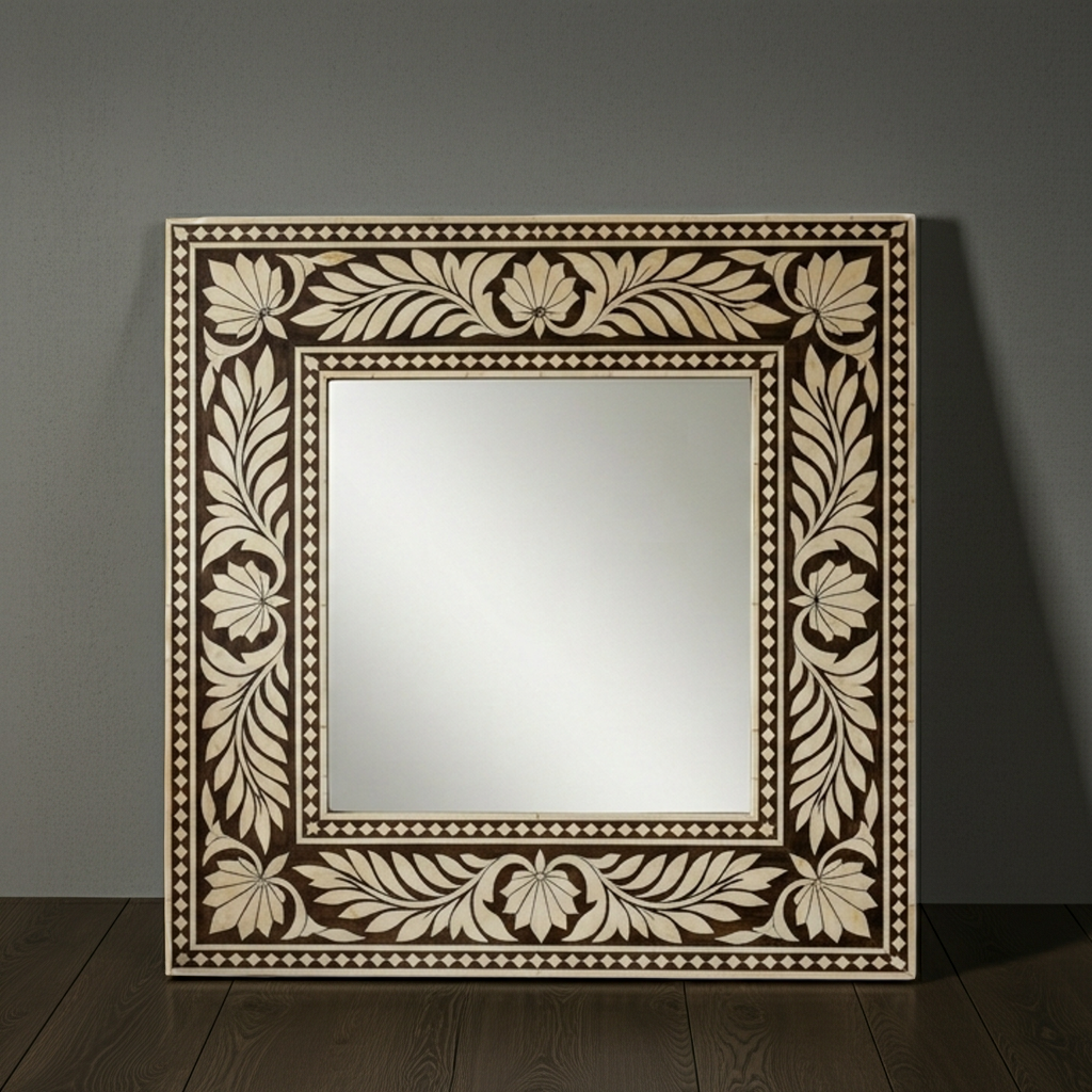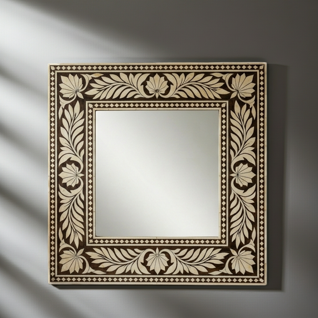 Bone inlay mirrors are produced by embedding individually cut bone pieces into a wooden base to create detailed floral patterns. The base is stabilized using engineered wood, which supports long-term structural performance.