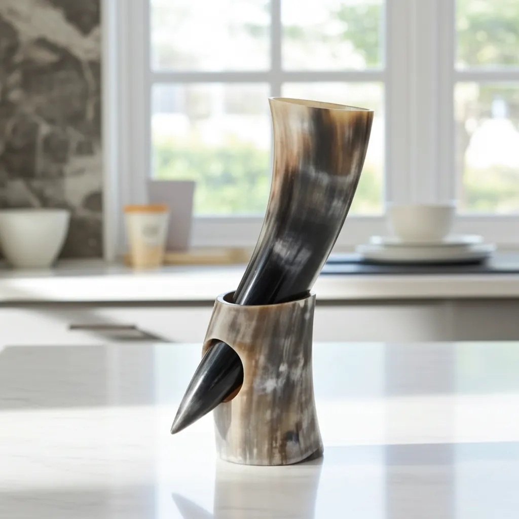 All horns are sourced responsibly as a natural by-product of the meat industry, supporting ethical and sustainable production. Each horn is cleaned, boiled, shaped, and polished using traditional techniques that preserve the natural grain and structure. The horn stand is carved and shaped from matching horn material, maintaining a cohesive look.