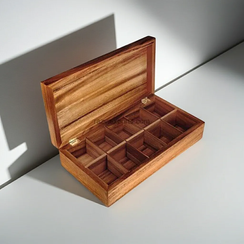 This handcrafted wooden box with sections is made from premium-quality acacia wood, finished in a natural polish that highlights its rich grain. Measuring 12x7x3 inches, it features multiple compartments ideal for storing jewelry, spices, tea bags, dry fruits, or small accessories. The sectioned design ensures organization and visual appeal, making it perfect for both kitchen and decorative use. Each piece is carefully polished for durability and smooth texture. Razvi Exports is a trusted manufacturer, supplier, and exporter of handcrafted wooden storage boxes, offering bulk customization, private labeling, and worldwide delivery. Perfect for homeware brands, gift stores, and hospitality suppliers.